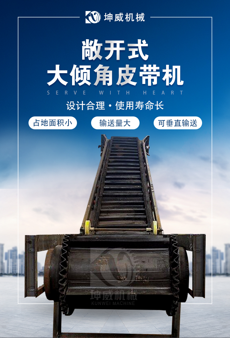 先說一下大 傾角帶式輸送機 的優勢 (1)大傾角帶式輸送機的輸送傾角大,可達90,是大傾角輸送和垂直提升的理想設備。因此可以節約占地面積,節省設備投資和土建費用,取得良好